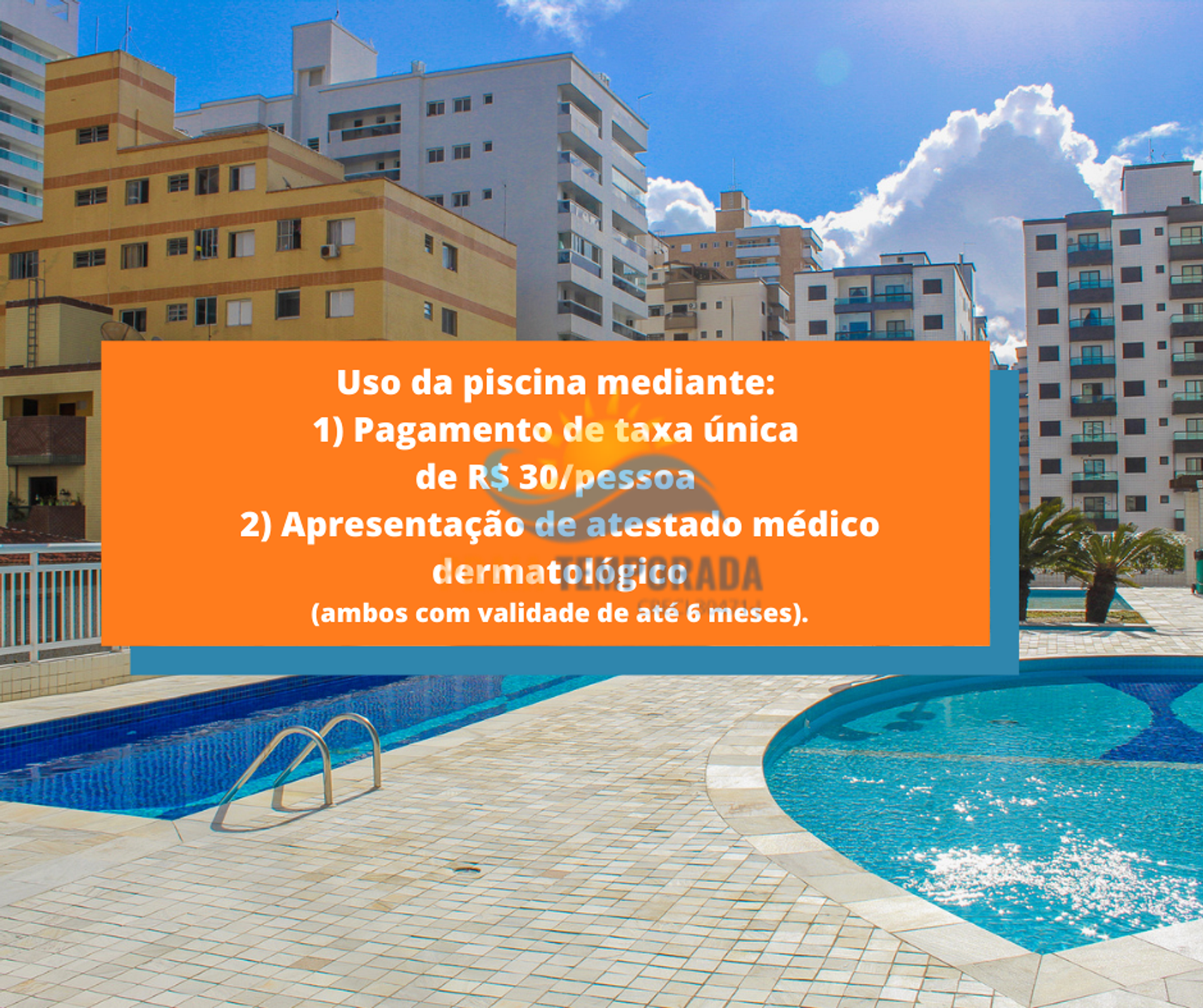 - Uso da piscina mediante pagamento de taxa adicional de R$30/pessoa e apresentação de atestado médico dermatológico (válidos por 6 meses).