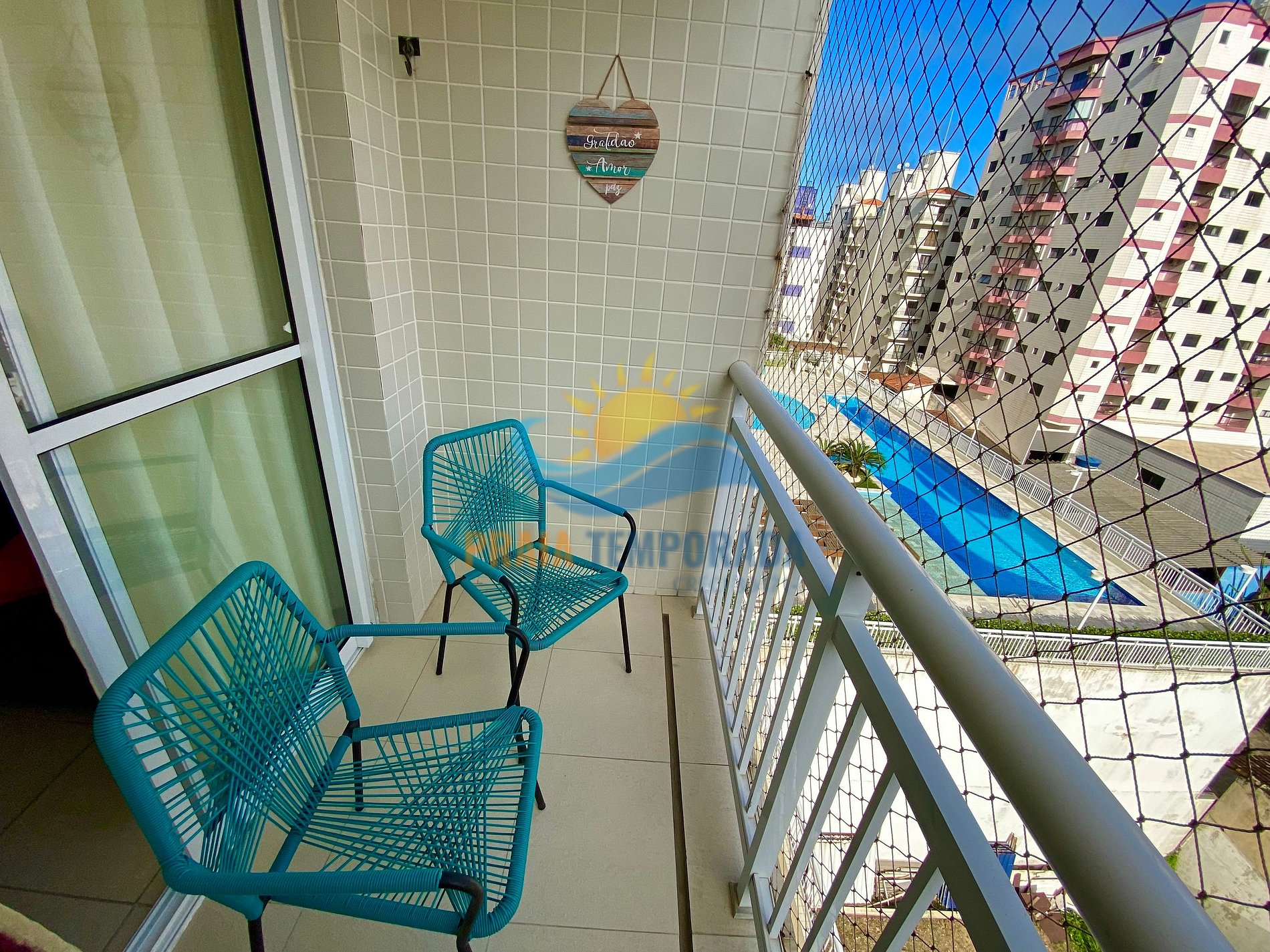 - Sacada com tela de proteção e vista para a piscina