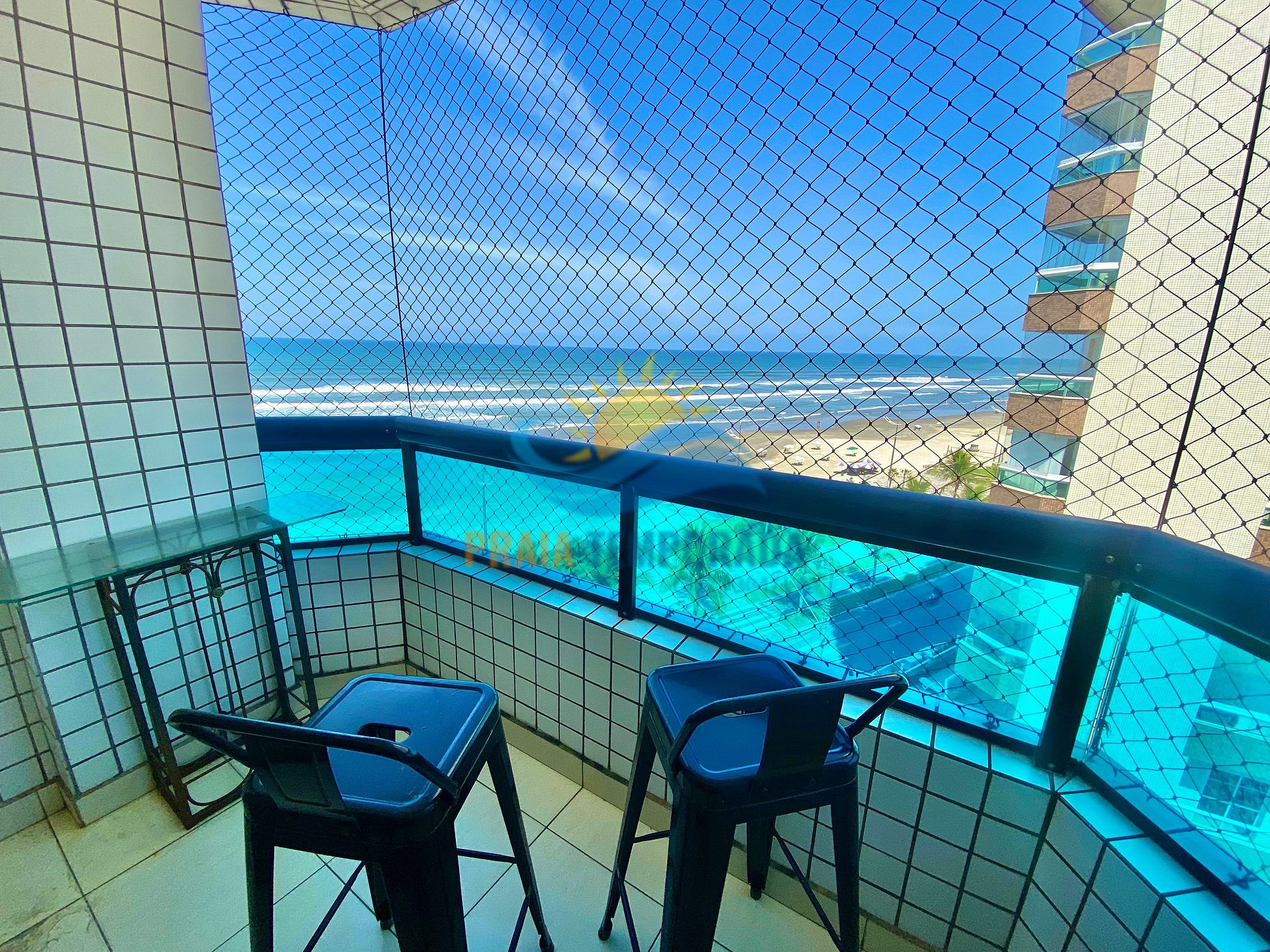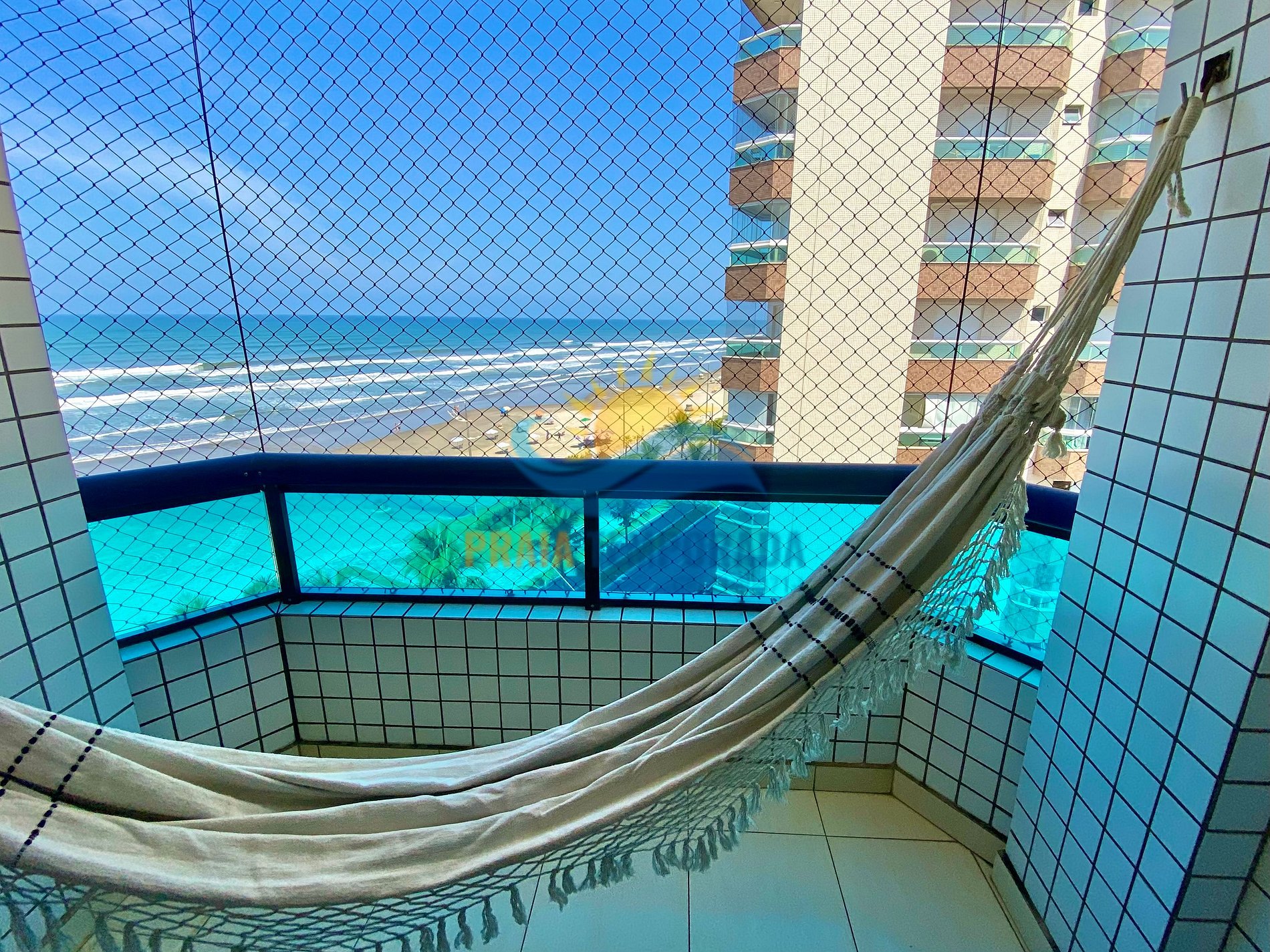 - Sacada com vista lateral para praia e tela de proteção