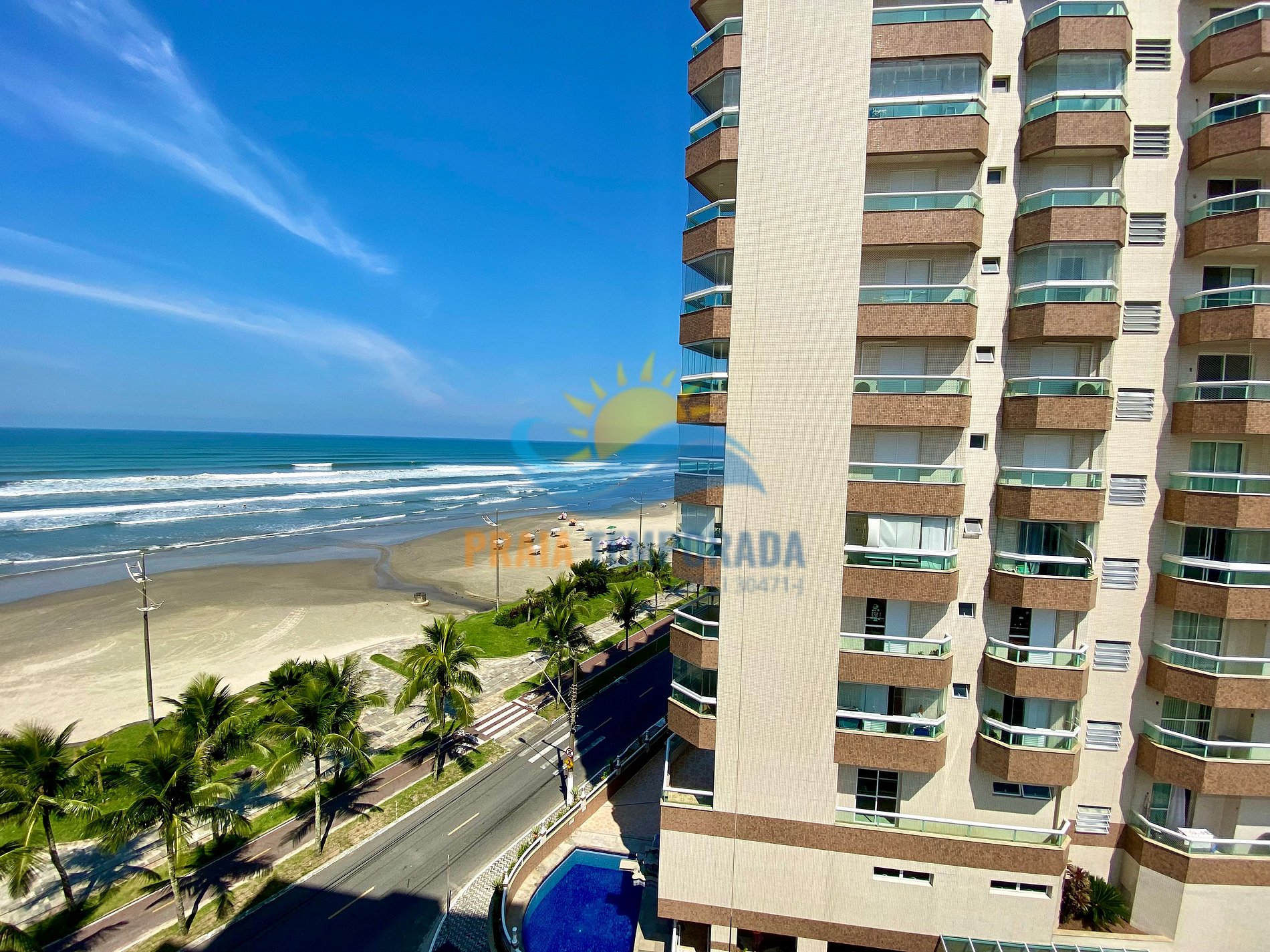 Apartamento em prédio frente a praia com sacada ampla e vista para o mar.