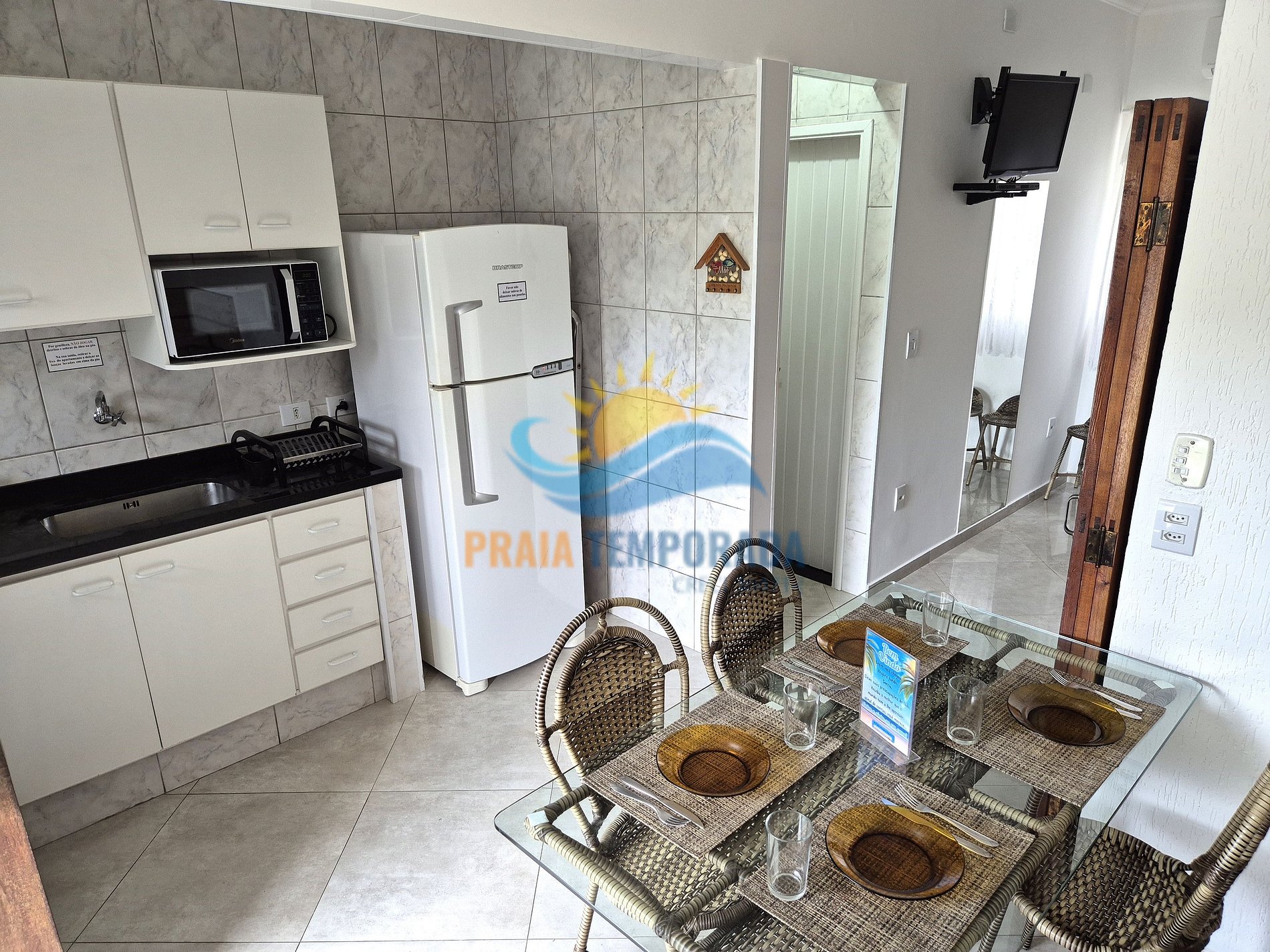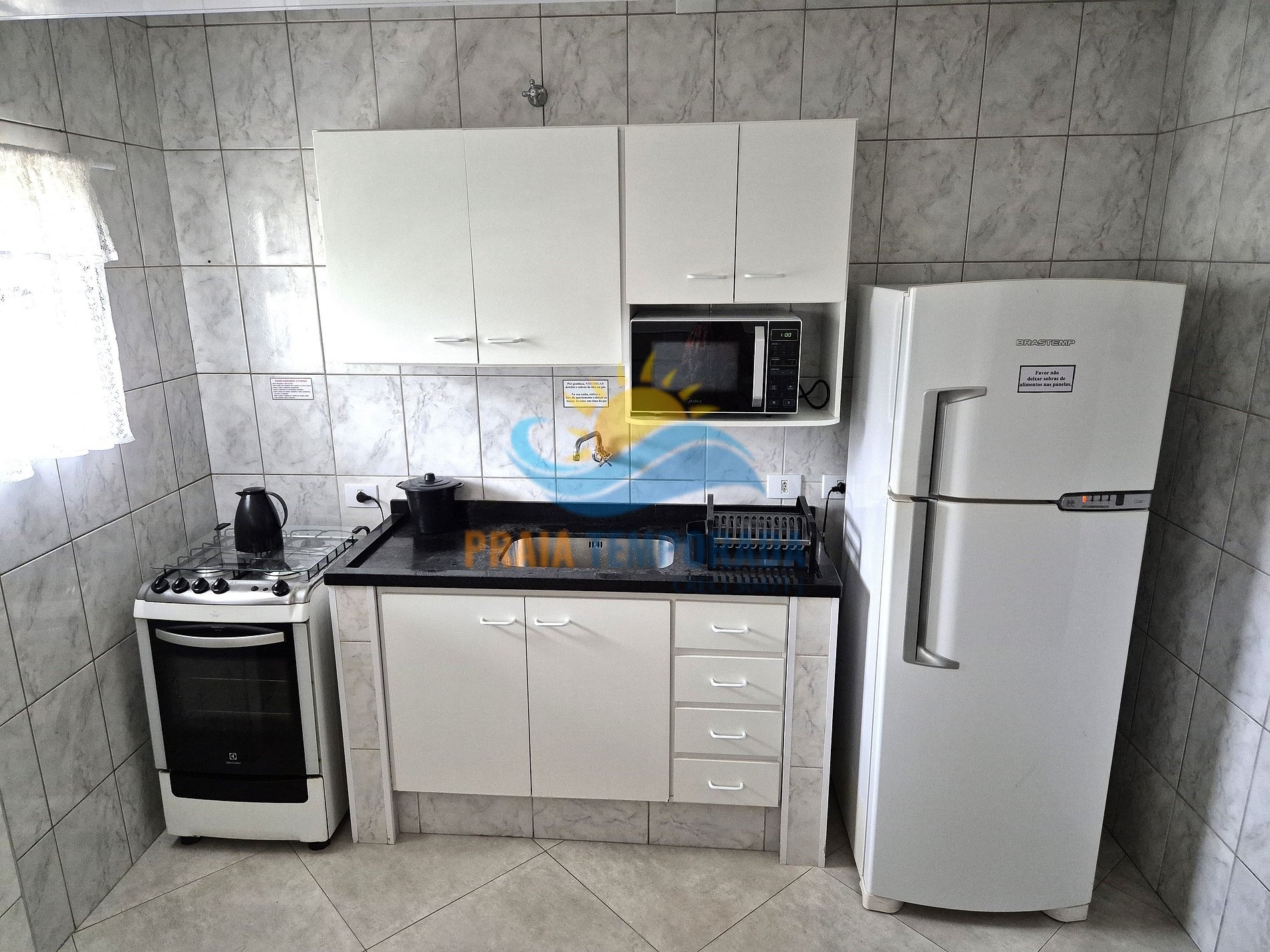 Cozinha com geladeira duplex frost-free, fogão, micro-ondas, liquidificador, utensílios de cozinha completo.