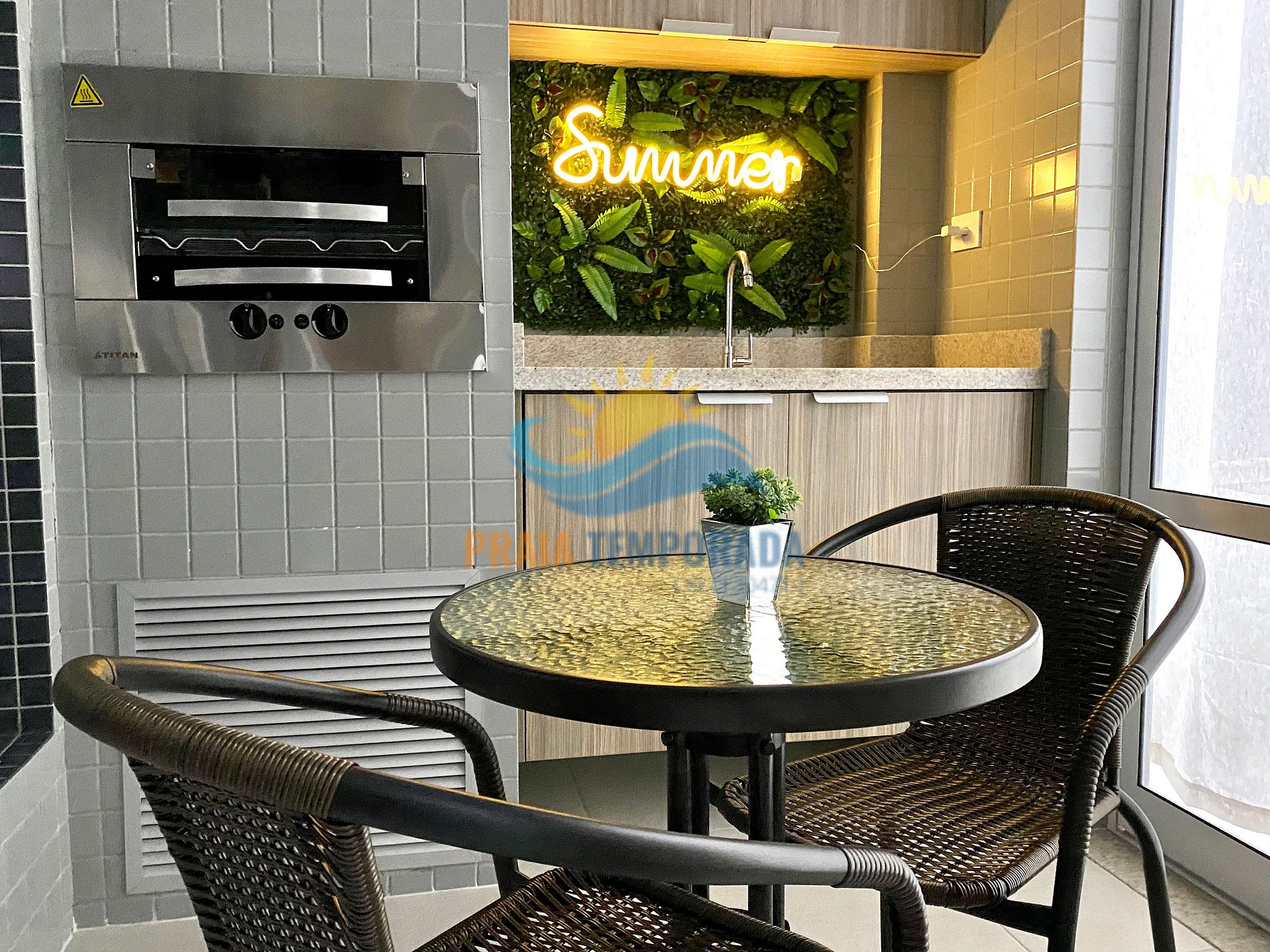 - Sacada com churrasqueira e fechamento em vidro com linda vista para a piscina