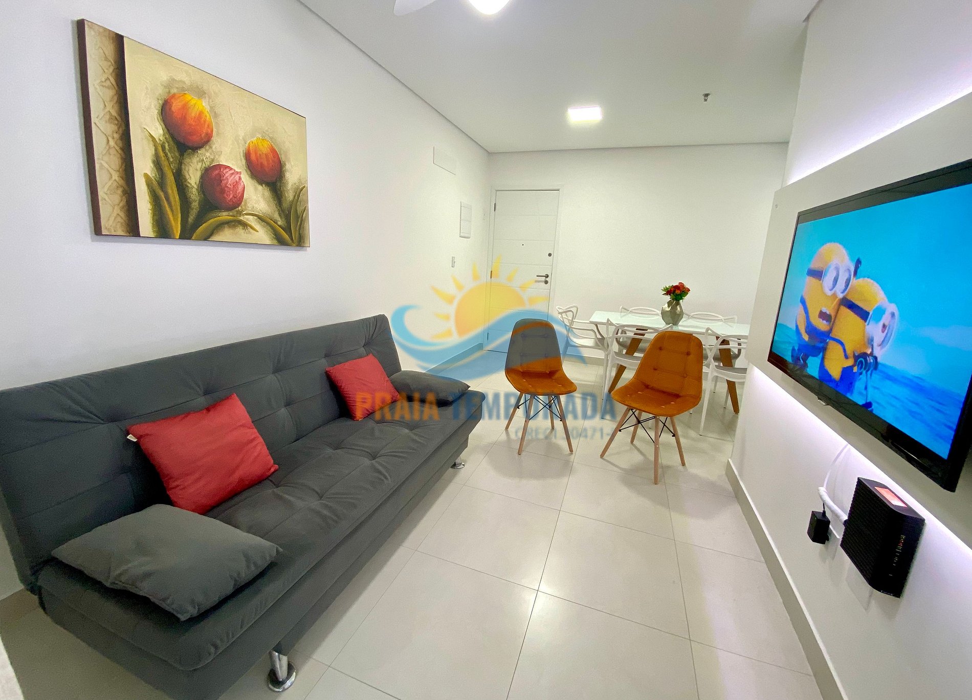 - Sala dois ambientes com um sofá-cama de casal e mesa de jantar